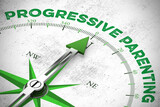 Kompass zeigt auf Schriftzug „Progressive Parenting“ als Konzept