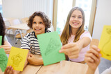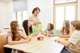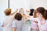 • Group of students and teacher discussing in school cafeteria with educational cards