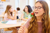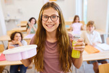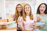 • Smiling teenagers enjoying drinks together in a school cafeteria setting
