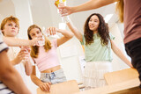 • Group of students raising water bottles in a cheerful school cafeteria setting
