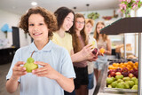 • Teenagers with trays of fruits queuing in a school cafeteria