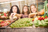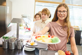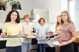 • Smiling students receiving healthy fresh food in a school cafeteria