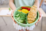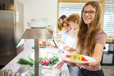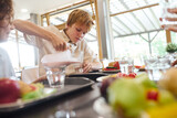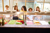 • Students in cafeteria self-serving fresh food and vegetables in a bright setting