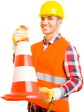 Lächelnder Bauarbeiter mit Verkehrsleitkegel