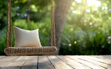 A serene swing seat adorned with a soft pillow, set against a lush green background and warm sunlight, inviting relaxation and tranquility.