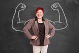 Lachende ältere Frau mit Muskel Armen als Konzept für Selbstsicherheit