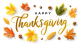 Happy Thanksgiving Calligraphy With Autumn Leaves And Pine Cones On White Background For Holiday Greetings And Seasonal Celebrations