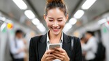 Smiling Asian Businesswoman Using Mobile Phone Inside Subway Train For Commuting And Mobile Communication In Urban City Lifestyle