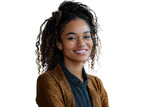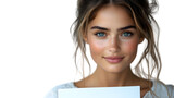 A woman with a soft smile holding a blank paper perfect for education communication and per