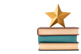 A gold star sits atop a stack of three hardcover books. Png, Transparent background.