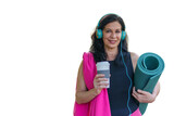 Yoga instructor holding coffee and mat listening to music on transparent background