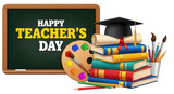 Happy teachers day message on a blackboard with a stack of books, graduation cap, and art supplies, isolated on transparent background