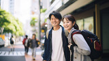 Young happy asian couple walking in Japanese city downtown