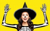 Happy woman in skeleton costume and witch hat excitedly raising hands