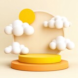 3D Rendering of Yellow Podium With Clouds and Sun on Beige Background Abstract Scene for Product Display and Presentation Backdrop