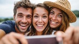 Happy friends taking a cheerful selfie outdoors with a mobile phone