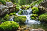 Lush waterfall flowing through moss-covered rocks in a serene forest setting