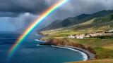 Rainbow spanning coastline under stormy clouds with verdant hills and blue ocean