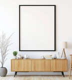 Minimalist interior with blank black poster frame on wall and wooden console table