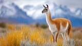 Guanaco standing in front of mountains in Torres del Paine, Chile