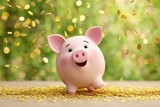 Cute piggy bank surrounded by golden coins on a wooden surface