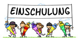 Cartoon Kinder feiern Einschulung mit Banner und Schultüte in Grundschule