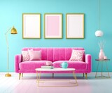 Bright pink sofa living room with turquoise wall, gold framed art, and stylish decor