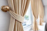 Beige curtains tied back on a white wall with a modern interior design
