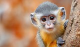 Endearing baby monkey clutching a tree with a curious and expressive gaze