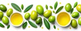 Fresh green olives and olive oil in bowls on white background for cooking and health