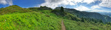 Wide panoramic view of lush green mountain landscape under a sunny sky