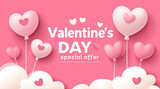 Valentine's Day Special Offer Pink Background With Heart Balloons And Clouds For Special Offer Promotions And Holiday Celebration