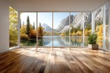 Spacious room with wooden flooring and panoramic view of autumnal mountain landscape
