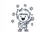 Cheerful cartoon child playing guitar with stars around for entertainment