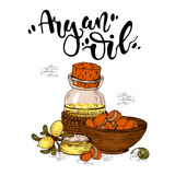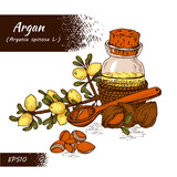 Composition with branch argan tree with fruits, nuts argans, leaves and glass bottle with oil and accessories Detailed hand-drawn sketches and lettering, vector botanical illustration.