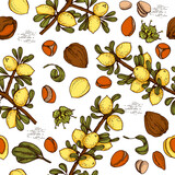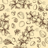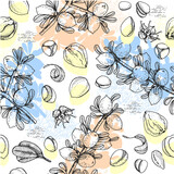 Seamless Pattern with branch argan tree with fruits, nuts argans, leaves, flower argans Detailed hand-drawn sketches, vector botanical illustration.