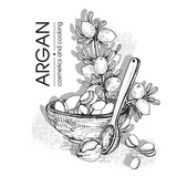 Composition with branch argan tree with fruits, nuts argans, leaves and accessories Detailed hand-drawn sketches, vector botanical illustration.