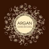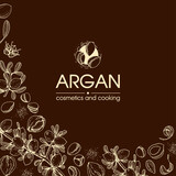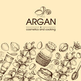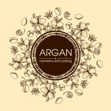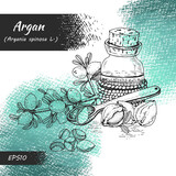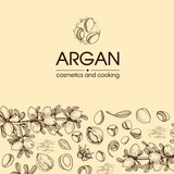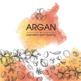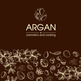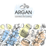Background with branch argan tree with fruits, nuts argans, leaves, flower argans and glass bottle with oil and accessories Detailed hand-drawn sketches and lettering, vector botanical illustration.