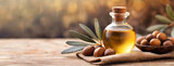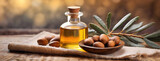 Argan oil and nuts displayed on rustic wooden background. The golden essence, treasured for its beauty benefits, is presented with its source nuts beside olive branches in a pastoral setting.