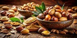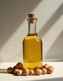 Argan oil and nuts displayed on rustic wooden background. The golden essence, treasured for its beauty benefits.