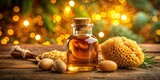 Luxurious argan oil, amber bottle, soft sea sponge; bokeh enhances the beauty product's allure.