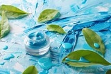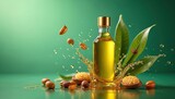 Argan oil bottle, nuts, leaves, splashes against green background. Skincare, cosmetic product. Natural organic treatment. Moroccan ingredients for beauty, health, wellness. Advertising, packaging