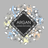 Frame with branch argan tree with fruits, nuts argans, leaves, flower argans Detailed hand-drawn sketches, vector botanical illustration.