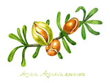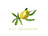 Watercolor. Famous argan plant from Morocco. Design advertising shops, cosmetic skin hair care oil products, beauty salon healthy menu, invitation card flyer poster cover, booklet packaging textile