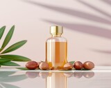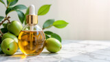 Argan Cosmetic Oil in Glass Bottle – Pipette Dropper with Green Fruits and Leaves on Light Background for Beauty Products, Skincare Advertisements, and Natural Cosmetics Marketing