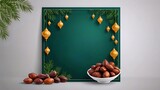 Elegant green frame with golden lanterns, palm leaves, and a bowl of argan nuts. Perfect for beauty, health, or cultural designs.