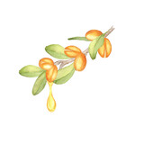 Watercolor clipart of a single argan branch with orange fruits, green leaves, and oil drops. Perfect for cosmetic branding, natural product advertisements, or eco-friendly stationery.