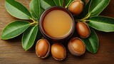 Argan oil in glass jar, with leaves on wood table, product promotion for health