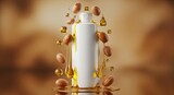 Cosmetic bottle with argan oil splash and nuts on golden background