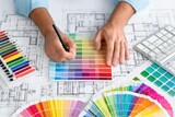 Designer Working With Color Palette Blueprint Keyboard and Pencils On White Table For Creative Projects And Design Inspiration
